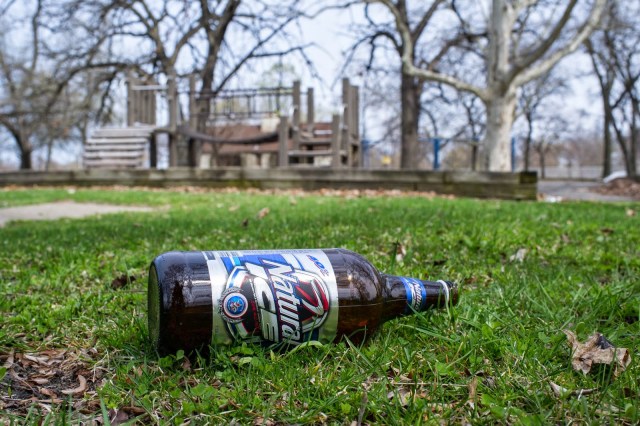 | An empty bottle of Natural Ice©beer on April 18, 2015 left near a playground in the area of Jackson Park that has been proposed as one of the potential sites for the Barack Obama Presidential Library. |