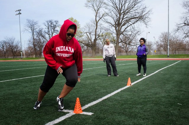 | As her flag football teammates Lena Bivins (center) and Vanessa Abron (right) watch, Charity Seaborn does a practice run Saturday afternoon, April 18, 2015, on Jackson Park Field. This image was published in the April 22, 2015 issue of the Hyde Park Herald. |