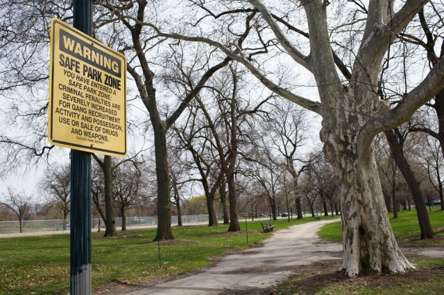 | A view of Hyde Park Academy High School, 6220 S. Stony Island Ave. on April 18, 2015, from the area of Jackson Park that has been proposed as one of the potential sites for the Barack Obama Presidential Library. |