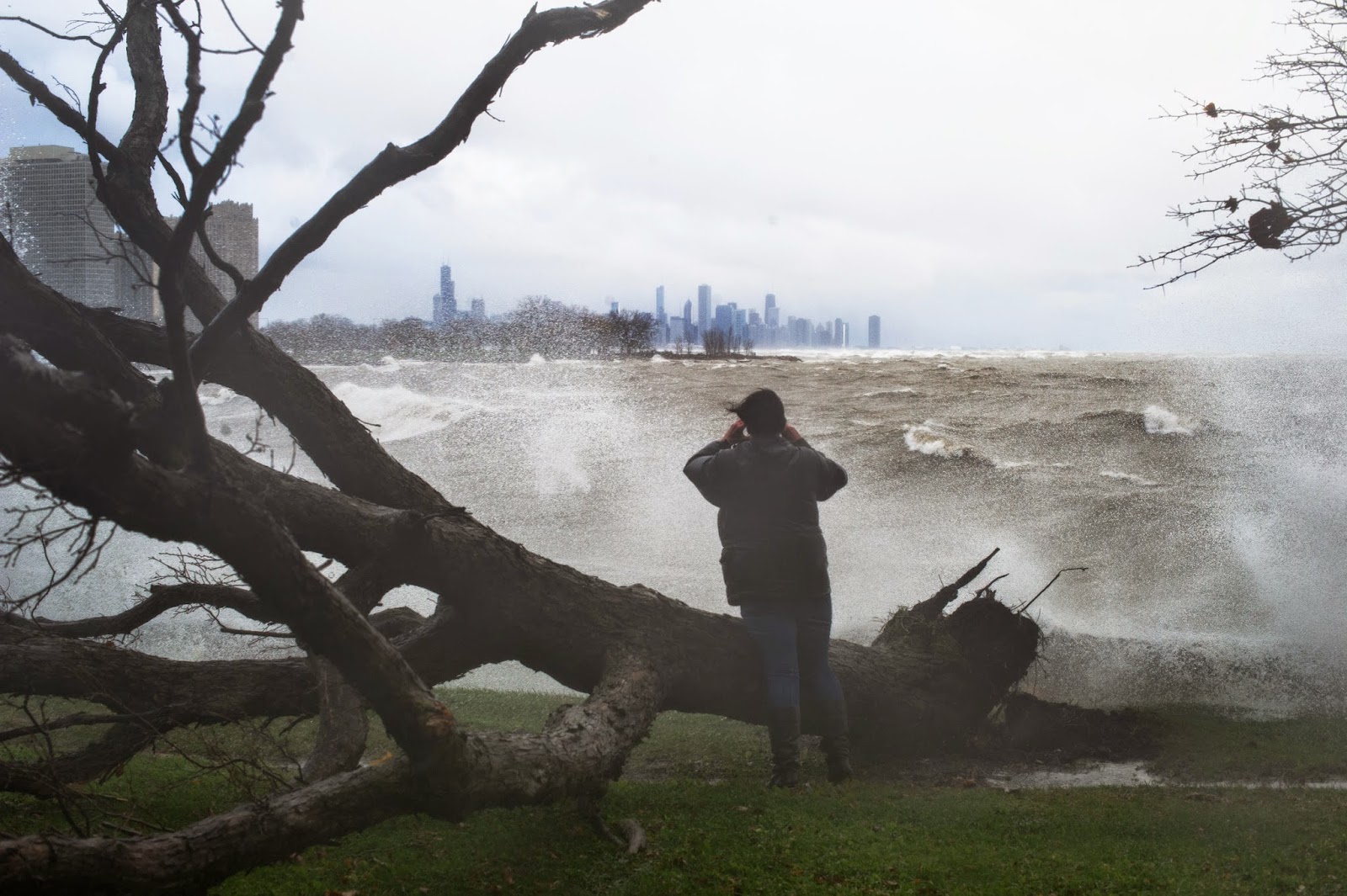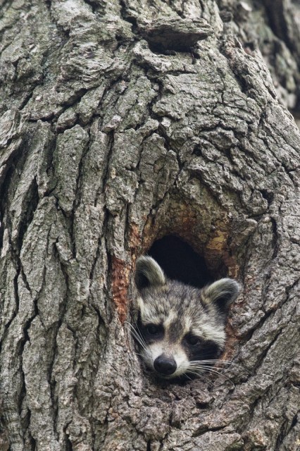 | In response to a recorded raccoon distress call, a raccoon peeks its head out of its nest in a tree growing in the section of Washington Park that has been proposed as one of the potential sites for the Barack Obama Presidential Library. This image was published in the April 22, 2015 issue of the Hyde Park Herald. |