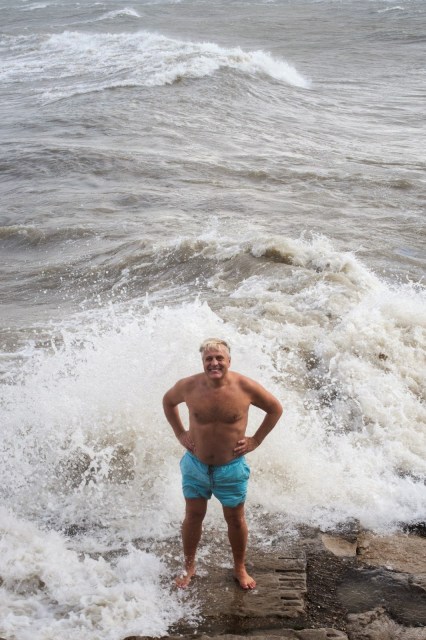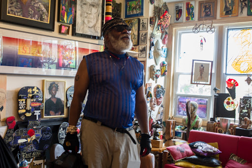 | Collector Patric McCoy waits for riders as they visit Pete Wade’s stained glass studio during the inaugural Hyde Park Art Center Art Ride, July 23, 2016. |
