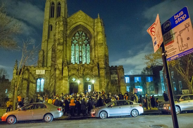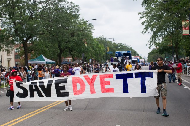 | A small contingent of community members carries a Save Dyett banner down Dr. Martin Luther King Jr. Drive |