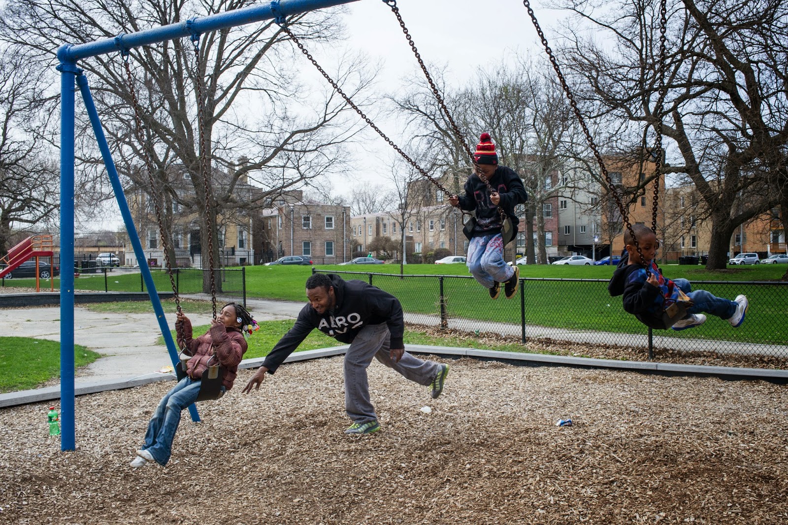 | The Nelson family enjoys the swing set April 18, 2015 in the section of Washington Park that has been proposed as one of the potential sites for the Barack Obama Presidential Library. This image was published in the April 22, 2015 issue of the Hyde Park Herald. |