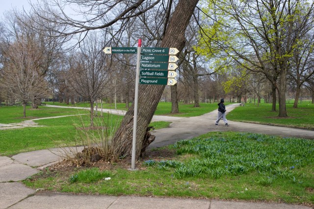 | A walker enjoys the paths in the section of Washington Park that has been proposed as one of the potential sites for the Barack Obama Presidential Library. |