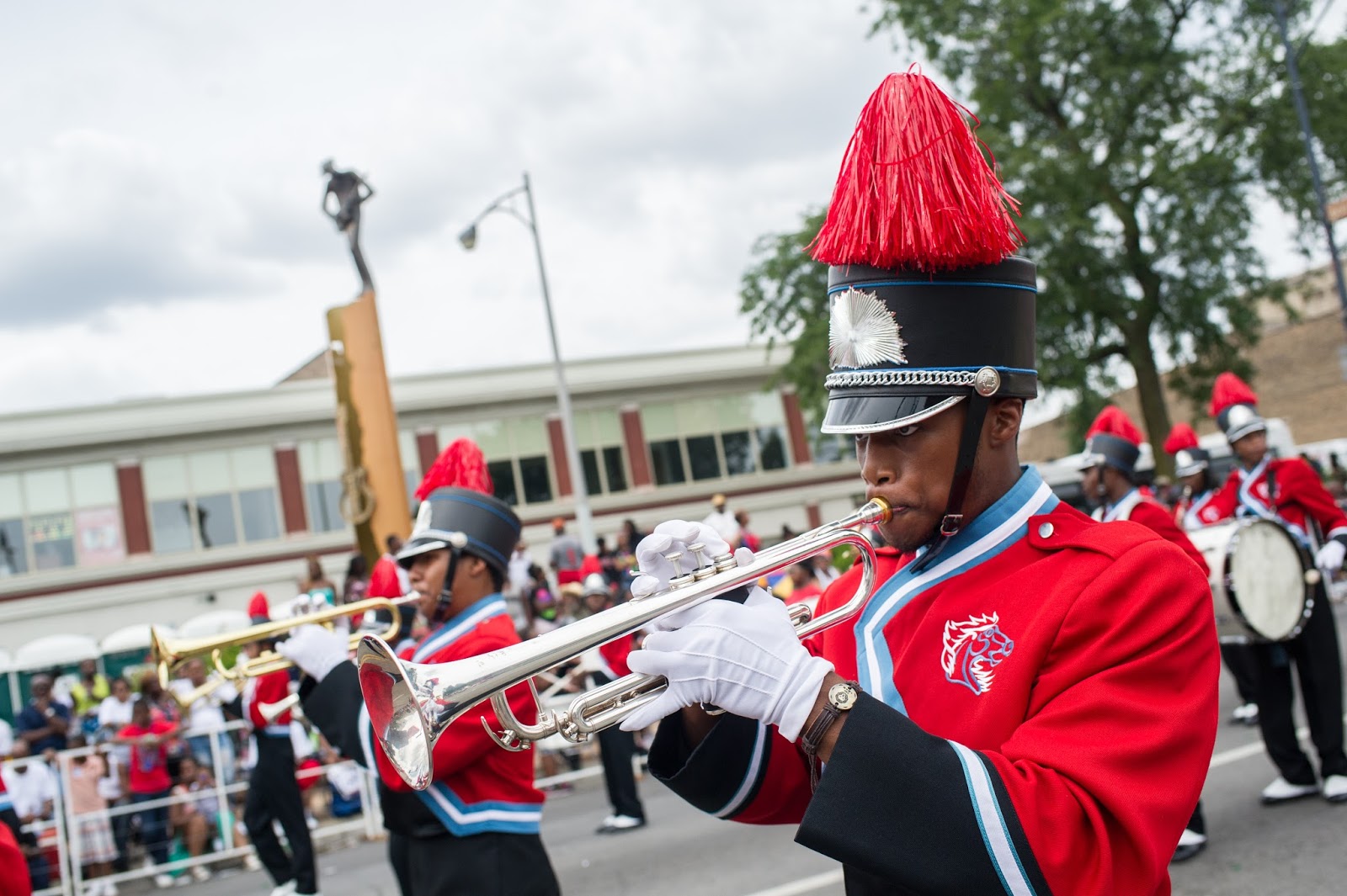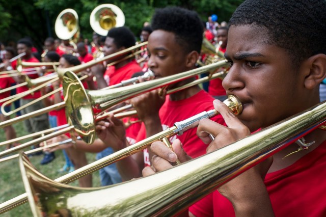 | Members of the Kenwood Academy High School Marching Band perform as they march down Dr. Martin Luther King Jr. Drive |