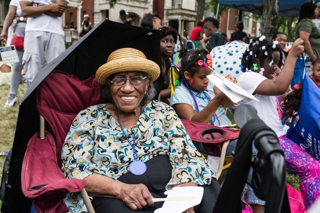 | Ninety three year old Philomae Dixon, a former Chicago resident, comes every year from her home in California to watch the Bud Billiken Day Parade |