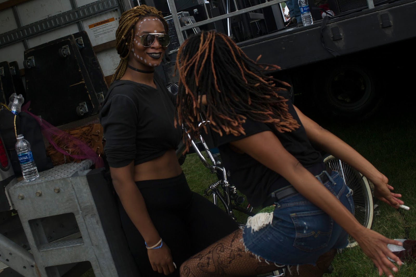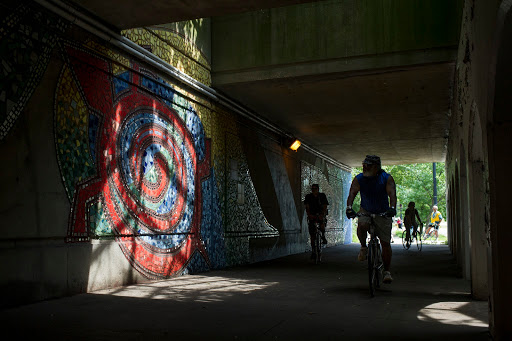 | Participants in the inaugural Hyde Park Art Center Art Bike Ride stop at 41st and Cottage Grove to view Justine Presha’ De Van’s 1977 mural “Black Women Emerging.” The mural is located on an east-facing abutment of the abandoned Kenwood branch of the Chicago an South Side Rapid Transit Railroad line. |