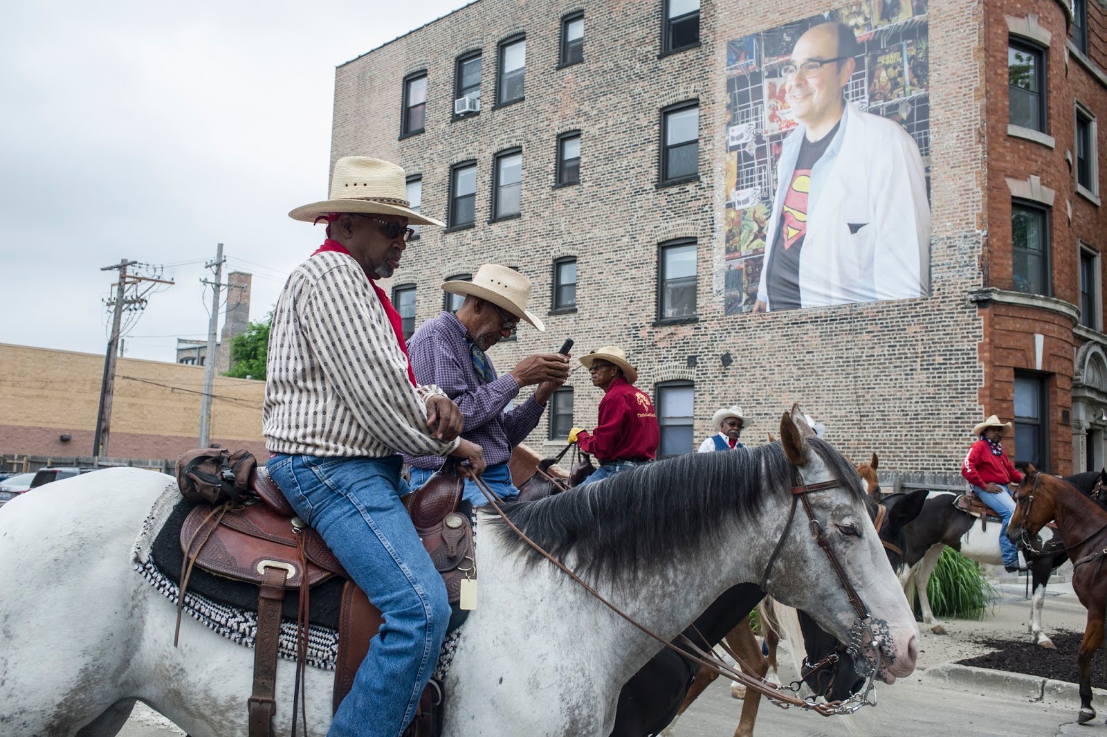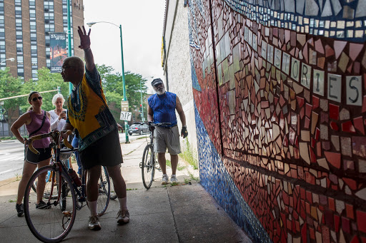 | Collector Patric McCoy discusses Mitchell Caton and Calvin Jones’ 1976 mural “Time To Unite” at 40th and Drexel during the Hyde Park Art Center’s inaugural Art Bike Ride, July 23, 2016. The mural is located on a west-facing abutment of the abandoned Kenwood branch of the Chicago an South Side Rapid Transit Railroad line. |