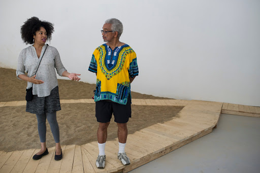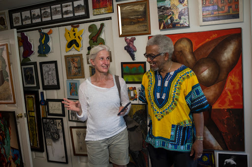 | Patric McCoy (on right) speaks with Sussane Kuper, an art historian and curator from Berlin, about the collection of art in his home during the inaugural Hyde Park Art Center Art Ride, Saturday, July 23, 2016. |