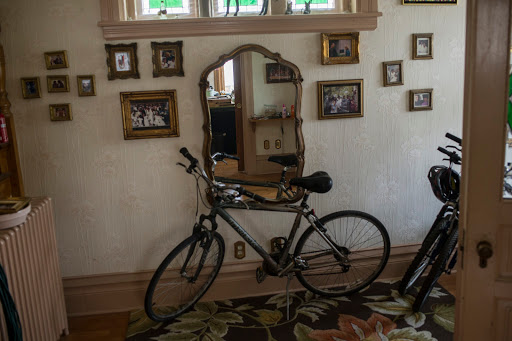 | Bikes in the entryway of Pete Wade’s house where he maintains a stained glass studio in what once was the living room. |