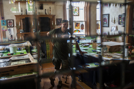 | Pete Wade in his stained glass studio which was visited during the Hyde Park Art Center’s inaugural Art Ride Saturday, July 23, 2016. |